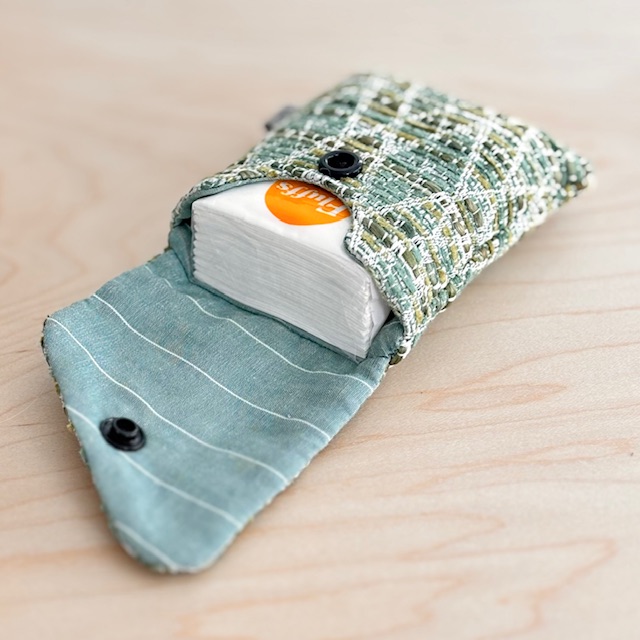 Fits the mini pocket tissue packs. Amazon, Dollor Tree and Dollorama have a wide selection of mini tissue packs.