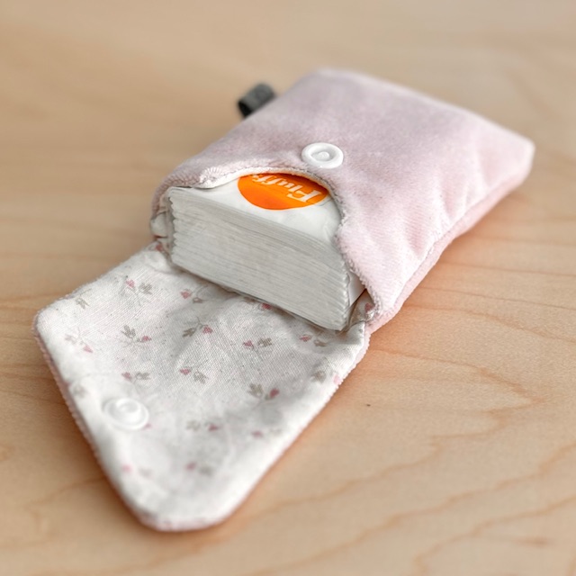Fits the mini pocket tissue packs. Amazon, Dollor Tree and Dollorama have a wide selection of mini tissue packs.