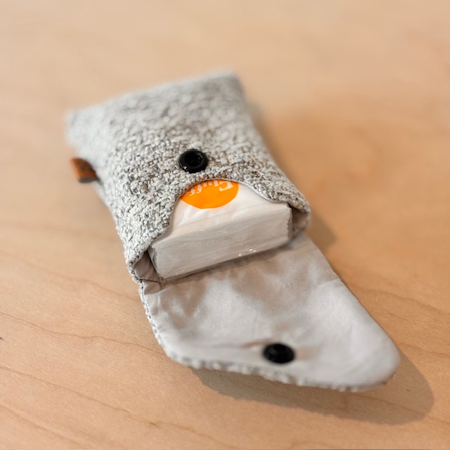 Fits the mini pocket tissue packs. Amazon, Dollor Tree and Dollorama have a wide selection of mini tissue packs.
