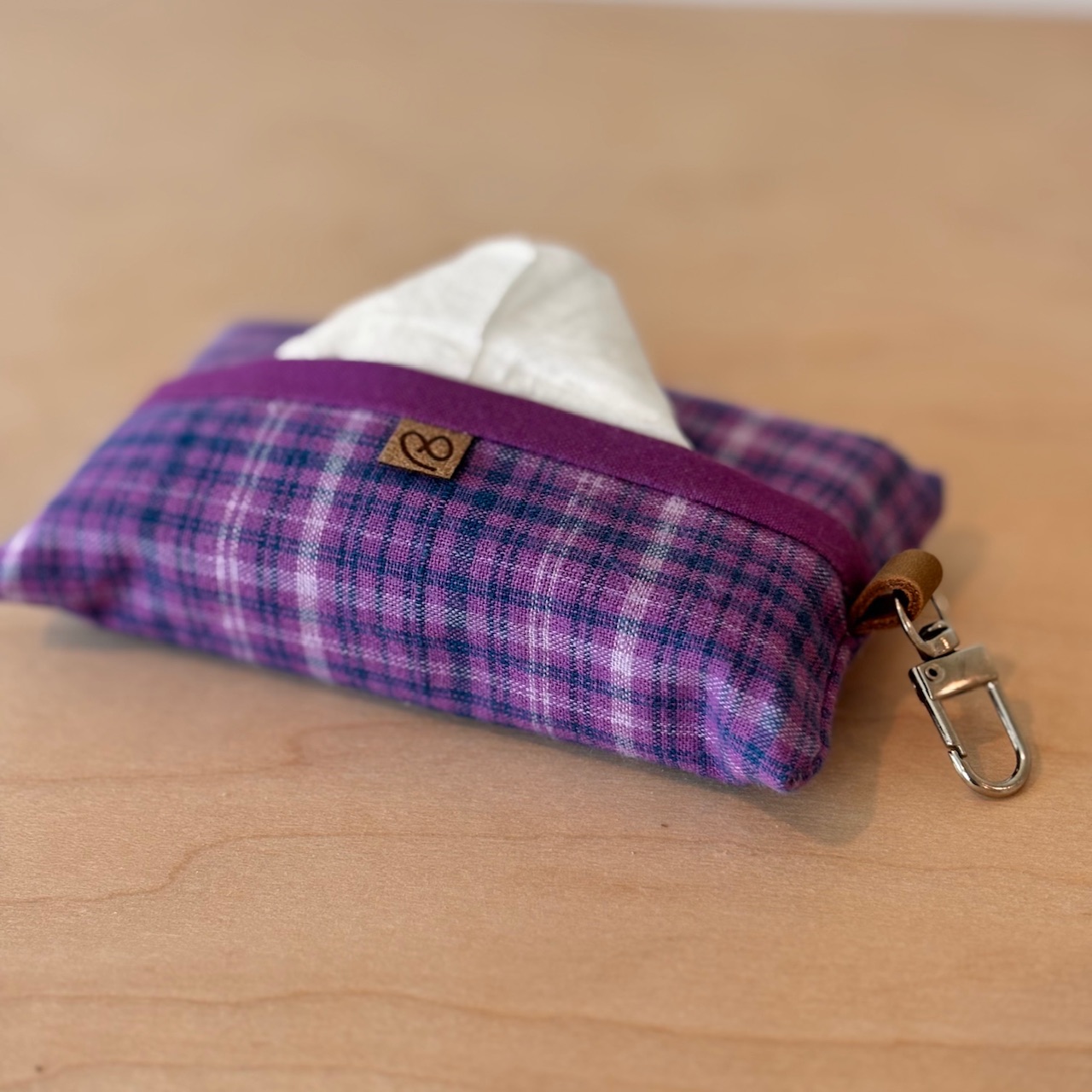 Keep your pocket tissues clean, organized and on hand. Perfect for adding onto your keys, in your purse or in the car. Handcrafted with recycled materials. Includes leather tab with swivel clip and one package of travel tissues.