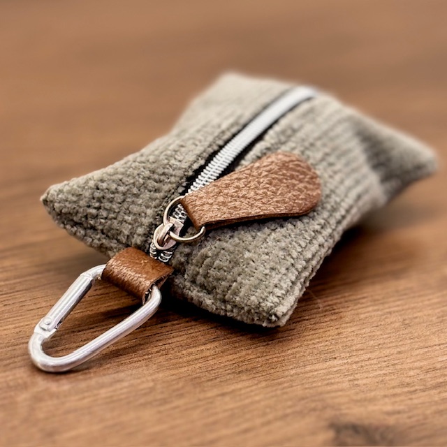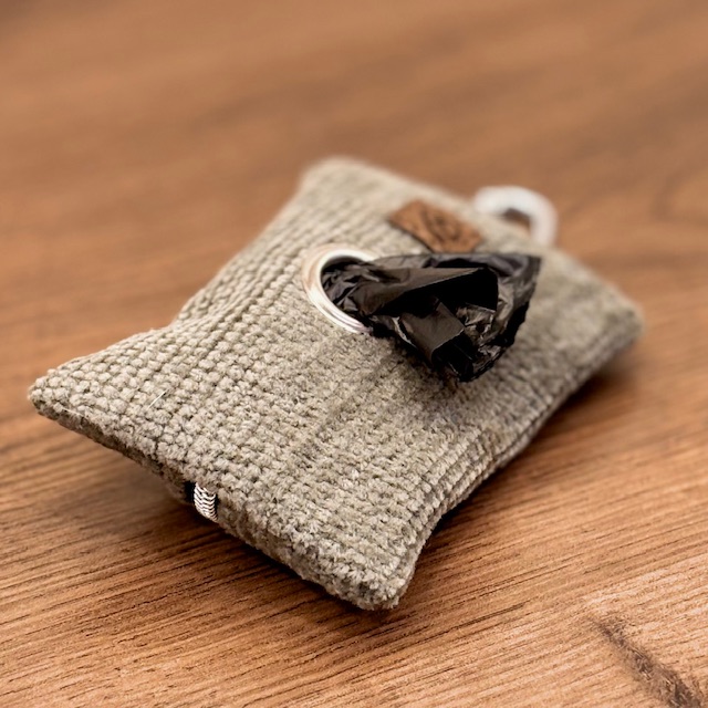 These poop bag holders are handcrafted from recycled materials. They feature a leather tab with a carabiner making them easy to clip where ever you please. The back has a zipper with a matching leather zipper pull for easy reloads.