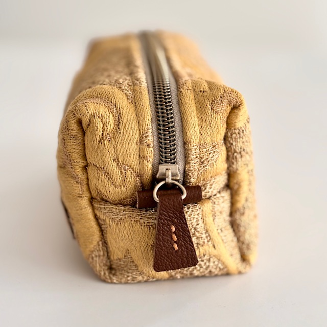 Made with recycled materials. Zipper pull and pull tabs are made with leather.
